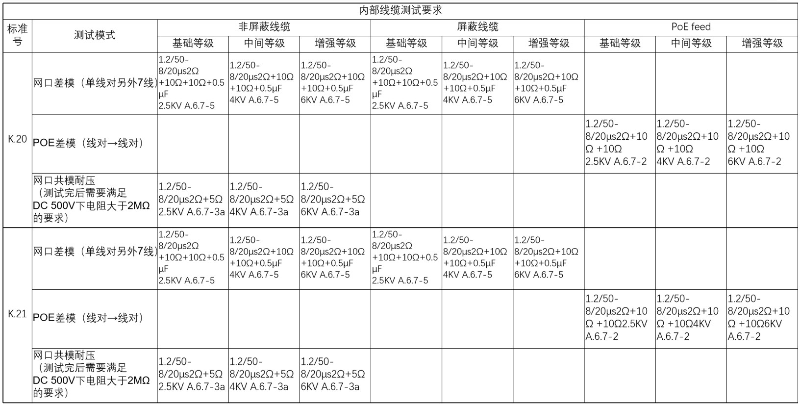 根據(jù)ITU-T K.20/K.21的測(cè)試要求,網(wǎng)口常見的測(cè)試等級(jí)如下:
