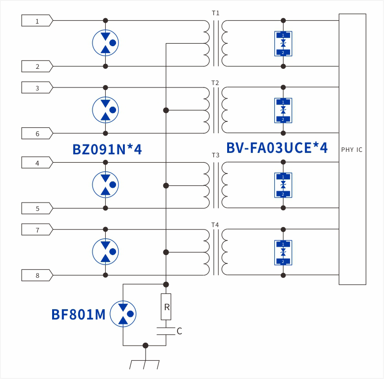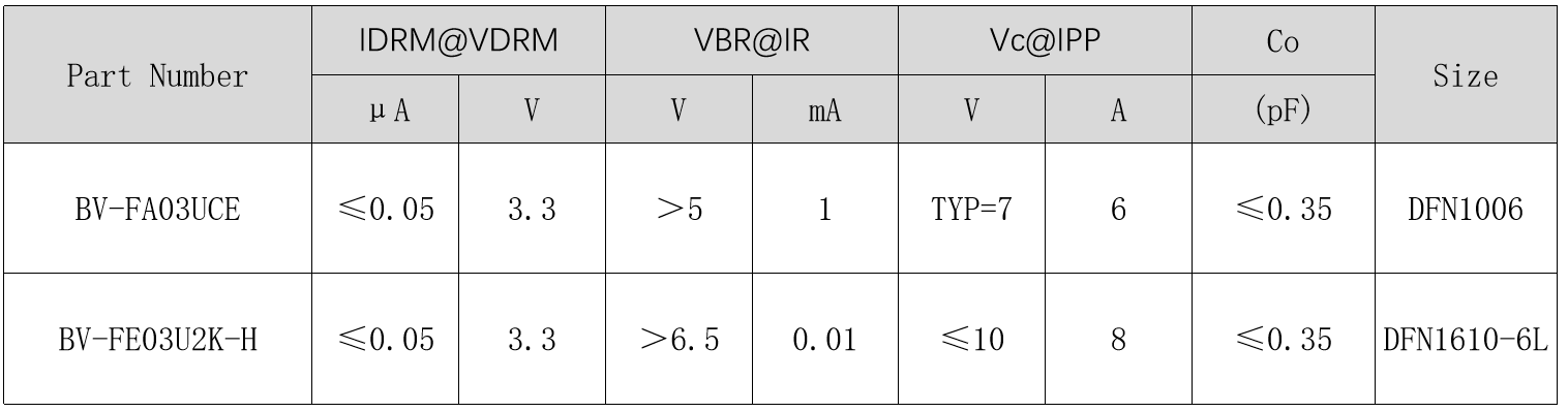 變壓器前級(jí)采用BZ091N用于解決初級(jí)6KV的大電流和高電壓,共模對(duì)地選用BF801M解決測(cè)試完后對(duì)地DC500V的絕緣耐用要求;變壓器次級(jí)采用BV-FA03UCE,低結(jié)電容,8A@8/20μs的IPP,適合用于5G 、10G的高速信號(hào)的EOS防護(hù)。器件的參數(shù)如下: