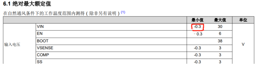 在充電IC手冊(cè)中,相信大多數(shù)伙伴都有留意到,有幾項(xiàng)極限參數(shù),其中有一項(xiàng),VIN最小電壓值,一般只有-0.3V左右,如下表。