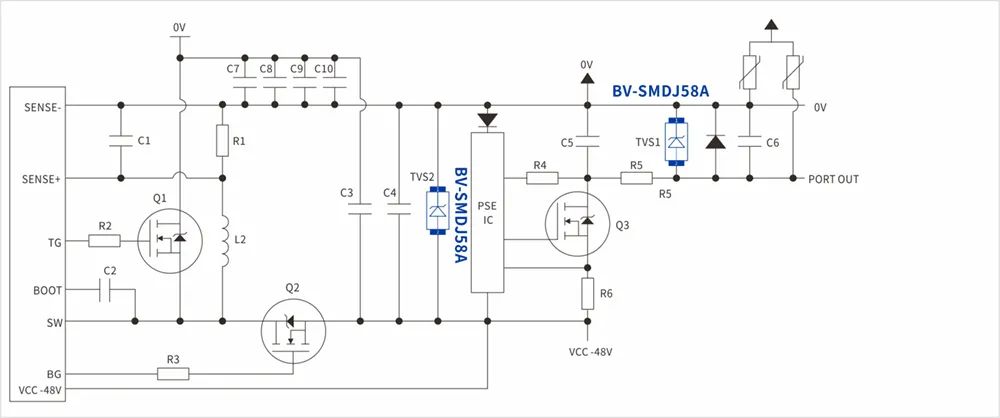 從原理圖上看,為了做好防護,在POE電源口做了兩級TVS 的防護,從應用電路上看,規(guī)劃的路徑是在接口處,IC的輸入前,將過電壓能量抑制在一個較低的水平,通過實際測試,PSE IC損壞。