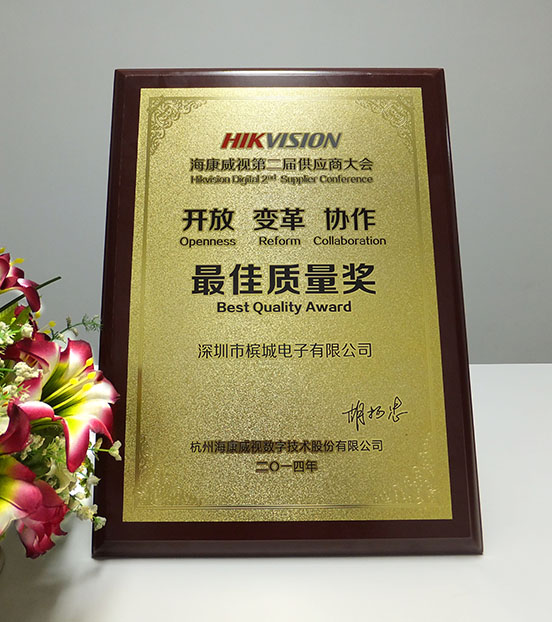 2014年,檳城電子憑借優(yōu)質(zhì)的產(chǎn)品和完善的服務(wù),在??低暤墓?yīng)商大會上喜獲“最佳質(zhì)量獎”的榮譽,這對一直在努力的檳城人是一個莫大的鼓舞,我們的汗水沒有白流,我們付出得到了收獲,全體檳城人將再接再厲,創(chuàng)造出更加美好的明天!